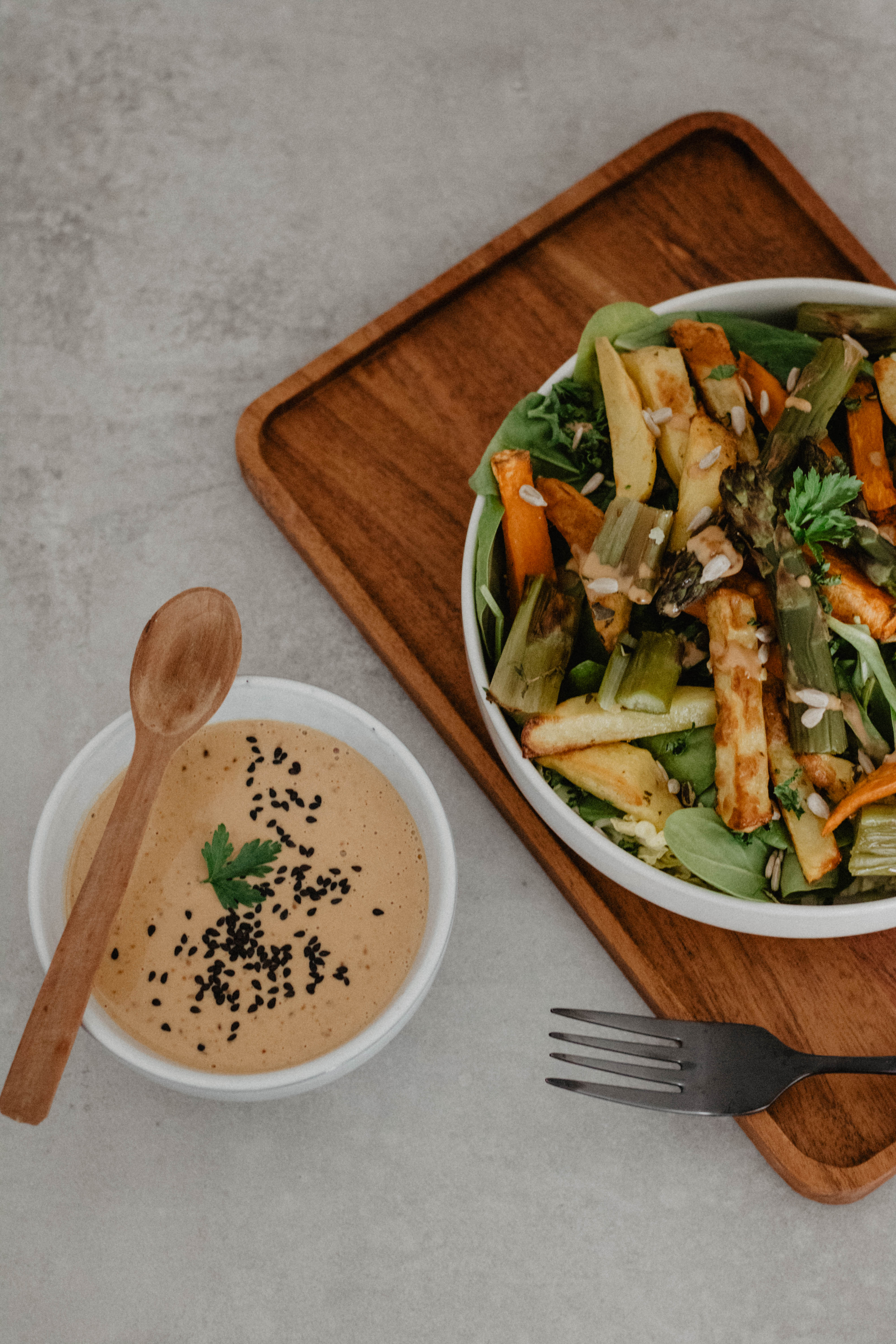 Nachdem sich der April mit so schönen sommerlichen Temperaturen offenbart hat, hatte ich ganz oft Lust auf eine leichte sommerliche Salatbowl 🤗 Gestern habe ich dann diese herrliche Bowl mit Ofengemüse und frischen Spargel vom Markt gemacht und das leichte Tahini-Erdnuss Dressing harmoniert einfach hervorragend dazu! 😍 Probiert das gerne aus.