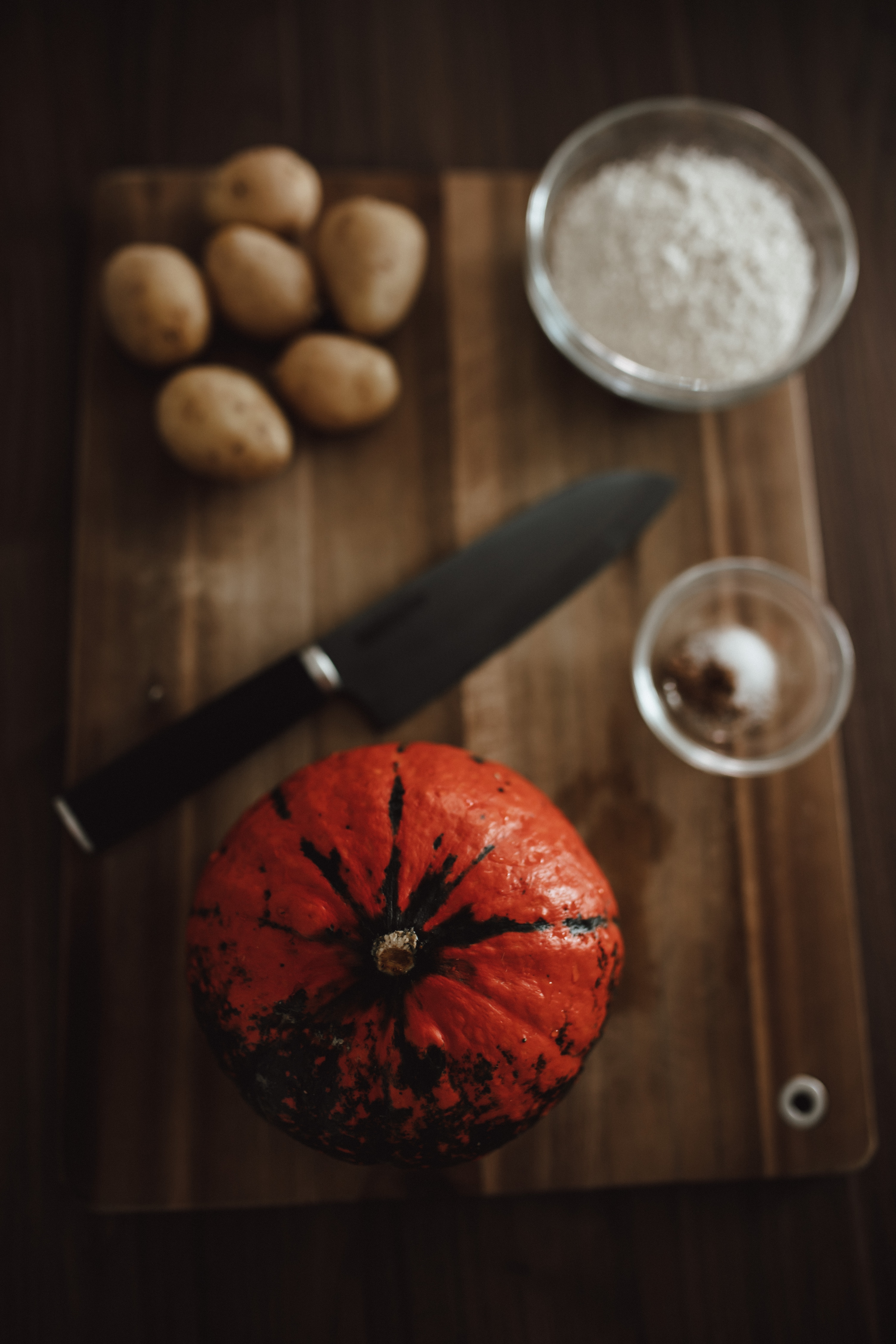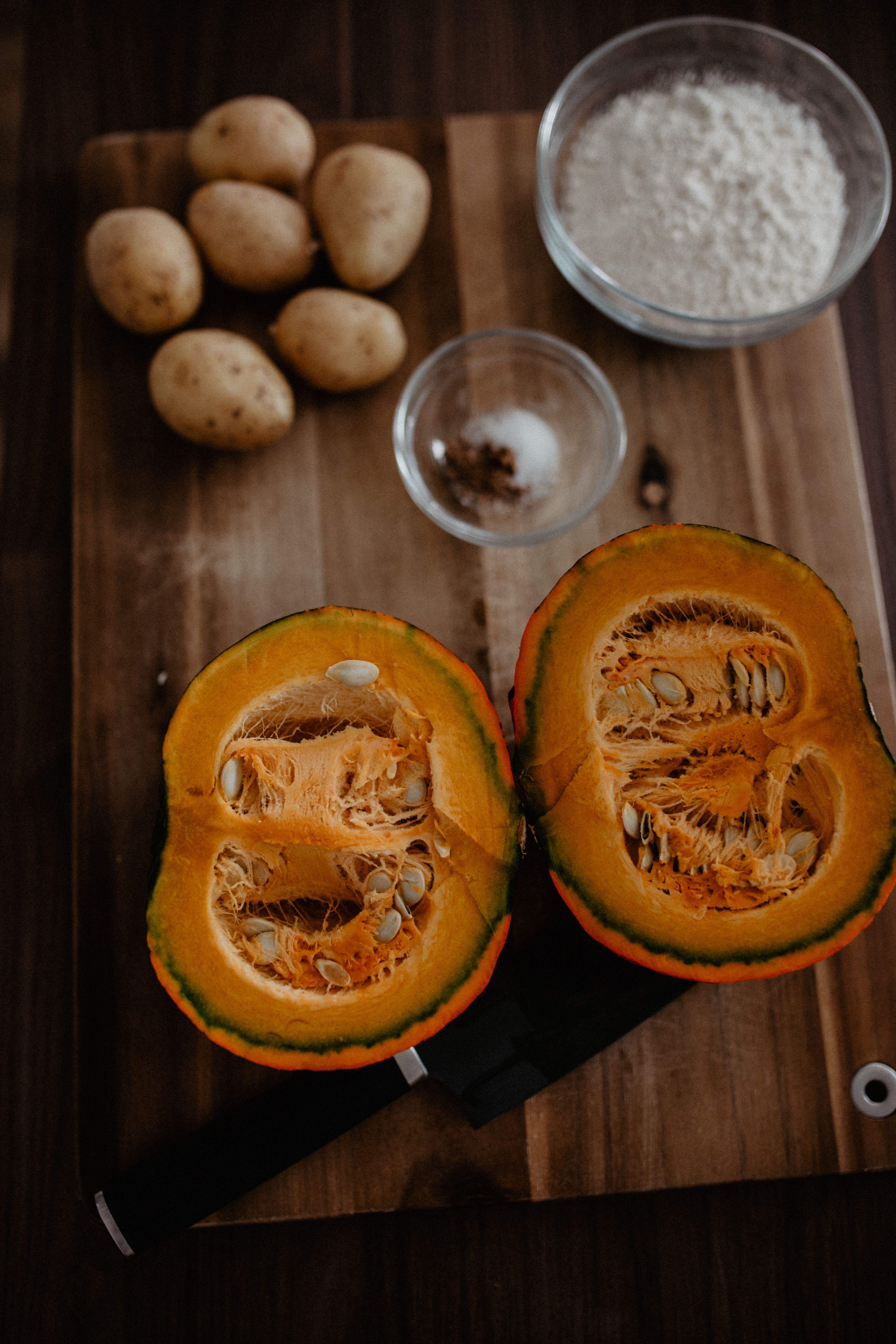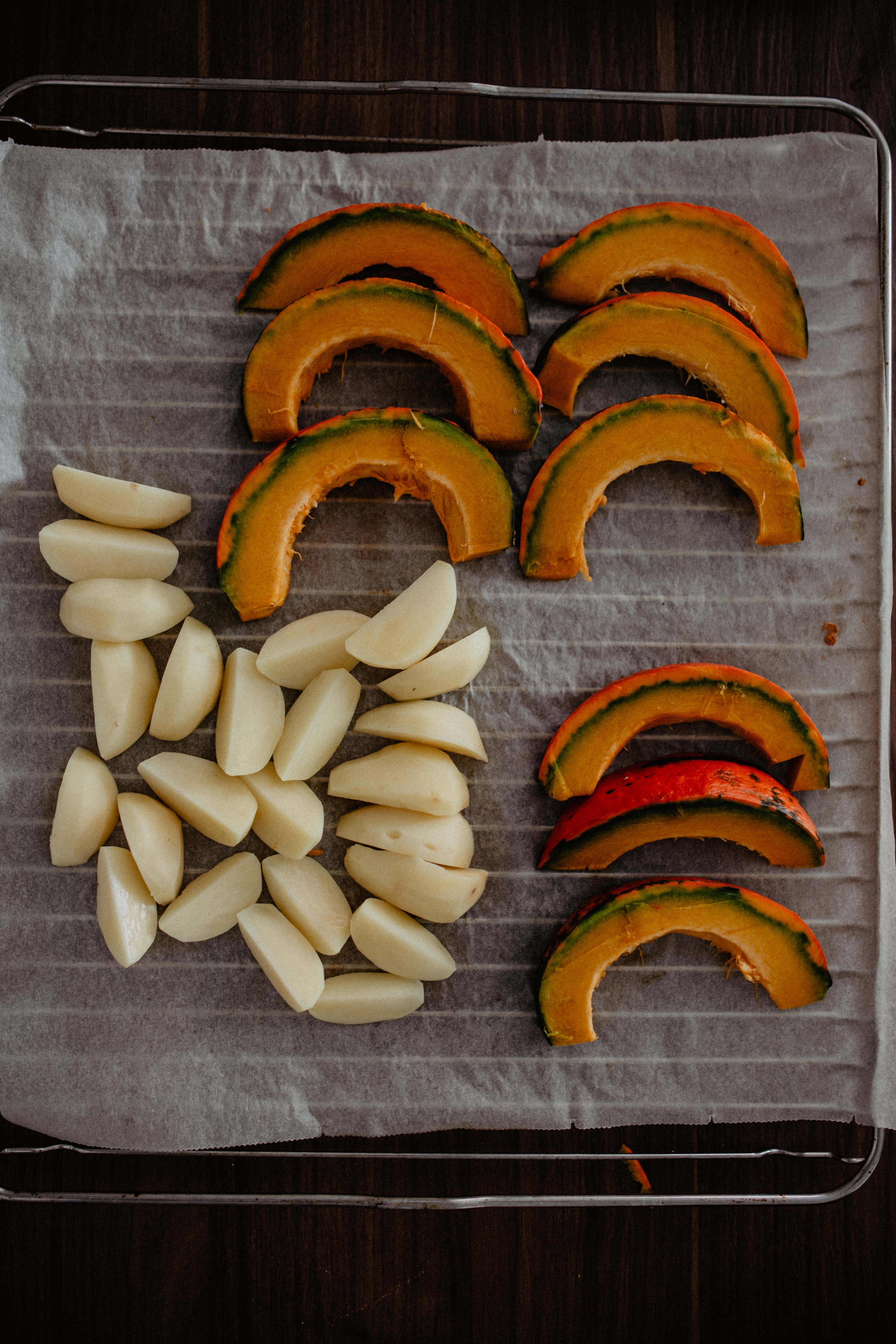 1️⃣Für die Kürbisgnocchi die Kürbisstücke und die Kartoffelwürfel auf ein mit Backpapier ausgelegtes Backblech legen und ca. 30 Minuten im Ofen bei 180°C garen. Danach aus dem Ofen nehmen und mit einem Kartoffelstampfer zerdrücken.