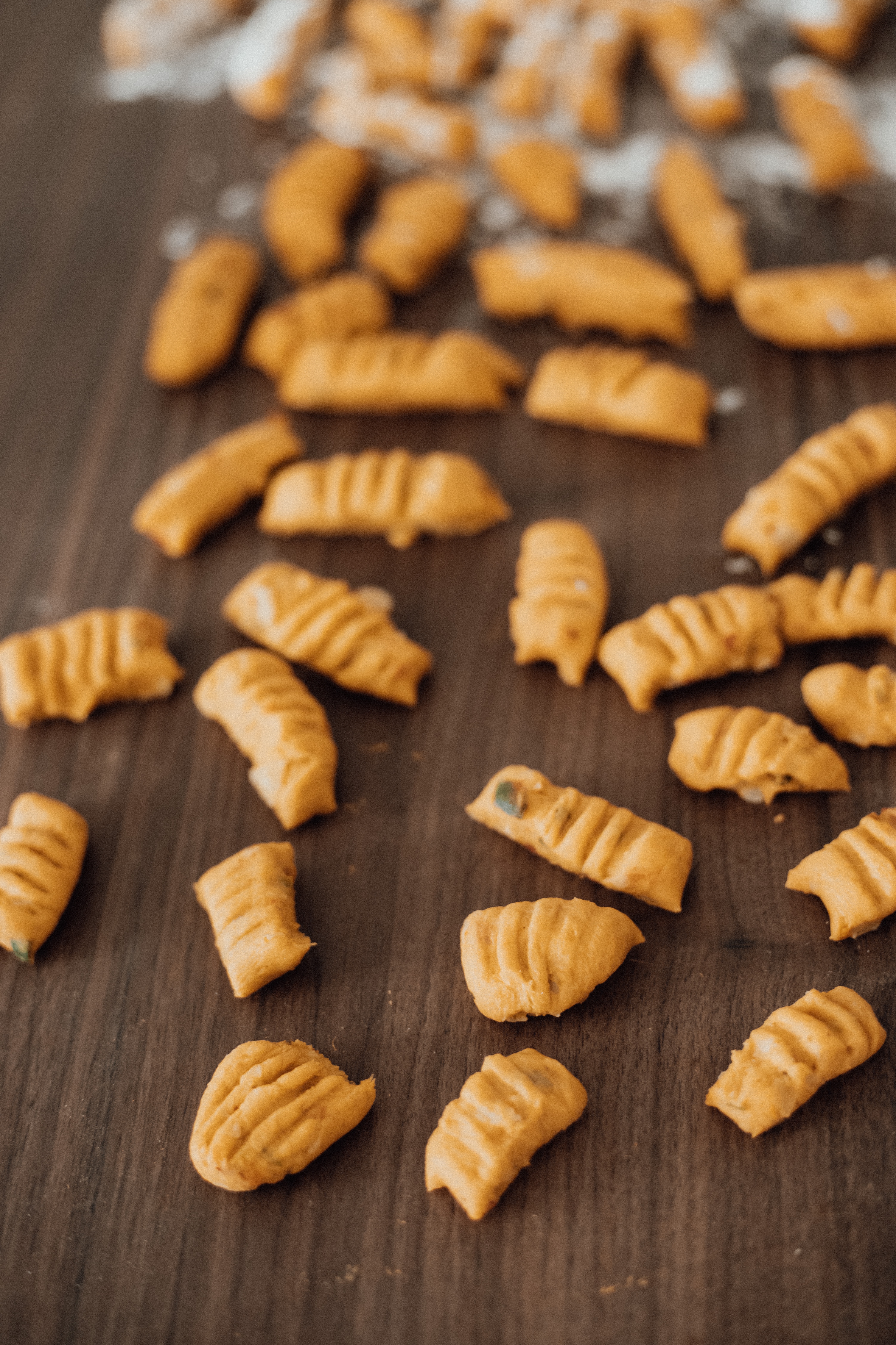 4️⃣Einen Topf mit dem gesalzenen Wasser zum Kochen bringen. Die Kürbisgnocchi so lange im Wasser belassen, bis sie von alleine an die Oberfläche steigen. Dann aus dem Wasser nehmen und über einem Sieb abtropfen lassen.