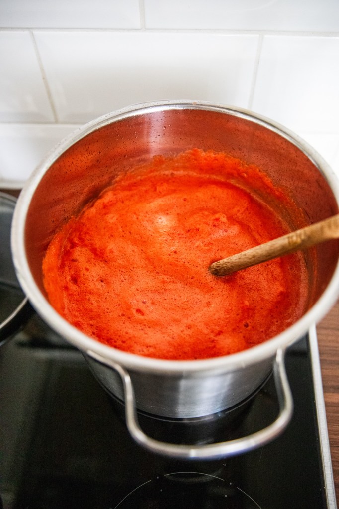 Nimm den Topf vom Herd und wenn die Tomatensauce etwas abgekühlt ist, gib sie in den Mixer oder püriere sie mit dem Pürierstab. Wenn du möchtest, kannst du die Tomatensauce einmal durch ein Sieb passieren und dann wieder in den Topf geben, aufkochen lassen und vielleicht noch einmal abschmecken.