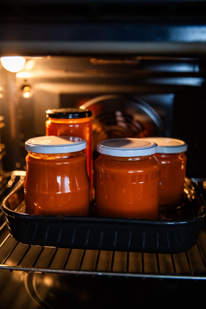 Heize den Backofen auf 100 Grad Heißluft vor. Fülle die heiße Tomatensauce bis 1 cm unter den Rand in die Gläser oder Flaschen. Es ist wichtig, dass oben etwas Luft bleibt, damit sich ein Vakuum bilden kann. Achte auf saubere Ränder (evtl. mit feuchtem Küchenpapier abwischen) und verschließe die Gläser sofort. Die Gläser mit etwas Abstand in eine Auflaufform oder in eine tiefe Fettpfanne stellen. In den Backofen schieben und mit heißem Wasser übergießen (ca. 2-3 cm hoch), dann den Backofen schließen und die Tomatensauce 30 Minuten bei 100 Grad einkochen lassen. Danach ist sie mindestens ein Jahr haltbar. Beim Abkühlen sollte sich ein Vakuum bilden, was man daran erkennt, dass sich der Deckel leicht einzieht und bei Berührung weder knackt noch nachgibt.